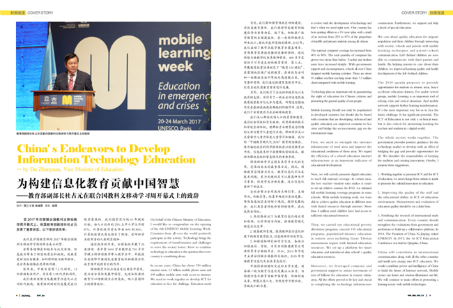 我代表中国教育部对2017年联合国教科文移动学习周的举办表示祝贺。世界各国都在积极参与此次活动。信息技术带来了转型的需求和挑战,使教育更好为社会服务。如何将科技与教学融合,是世界各国都在思考的问题>>>