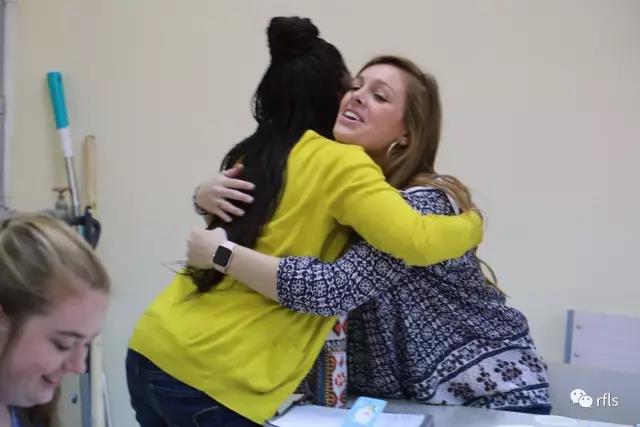 4月28日上午,王府外国语学校小学部为从北卡州立大学远道而的实习外教们举办了简单而温馨的欢送会,在教务处代静主任的主持下,实习外教和她们的指导教师互相拥抱、道别,互留送别卡。