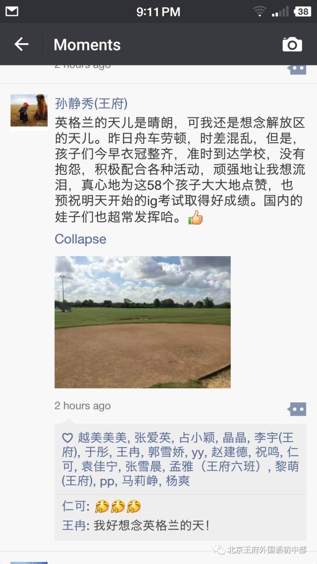初三年级主任孙静秀老师是此次赴英求学活动的负责人之一,在抵达英国,一切安顿之后,孙老师在朋友圈里对孩子们的表现点了大大的赞!每一位学子在抵达当天就与寄宿家庭的主人们见了面,在英国的“家”落了脚。