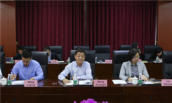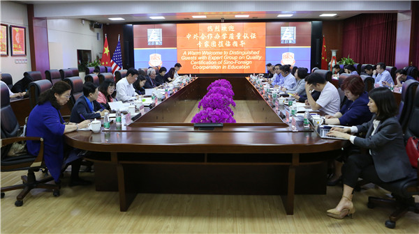 ▲中外合作办学质量认证专家团一行和我校校长王广发进行座谈