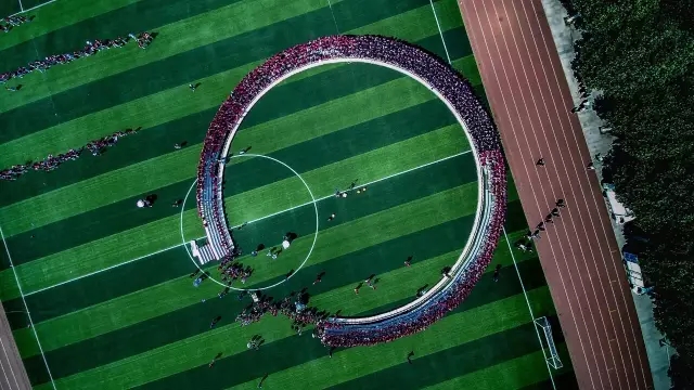 1800名师生中有应届高三毕业生321名,初、高中学子共计1400名,教职员工约400名。在王府大操场上,四层的铁梯架围成了一个大圆弧,被师生们站得满满当当,透过航拍的镜头,俯瞰之下让人直呼“太壮观!”