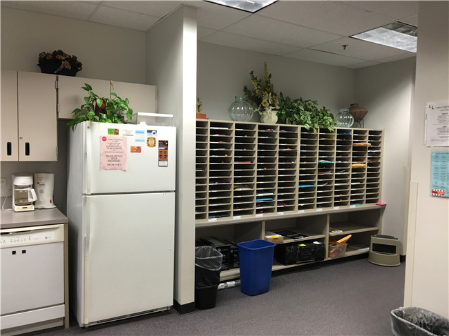 午饭时间,我们看到了老师的休息间,整洁明亮,摆放有序,我们开玩笑说,“看一所学校是不是好学校,只要看他们的教师休息室或茶歇间就知道了。”
