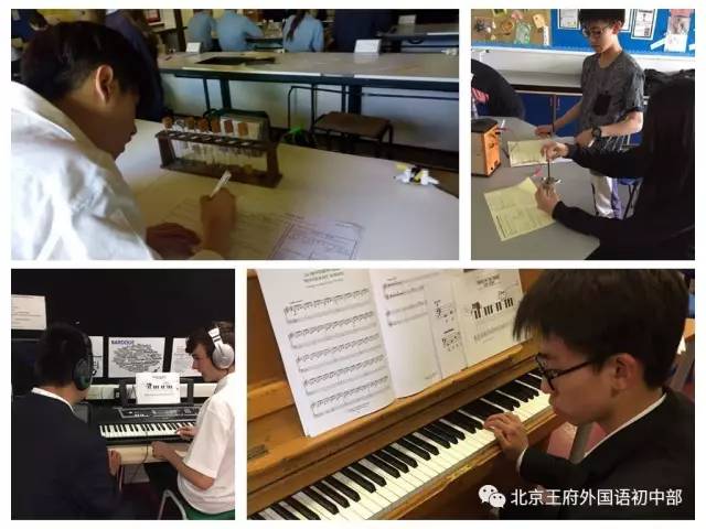 图为孩子们的课堂剪影,参与化学实验报告填写、完成物理课实验,孩子们表现了积极的动手能力。音乐课上,与英国同学们互相交流心得。