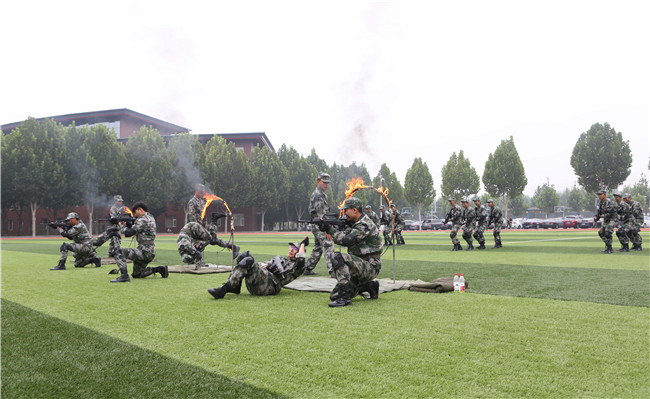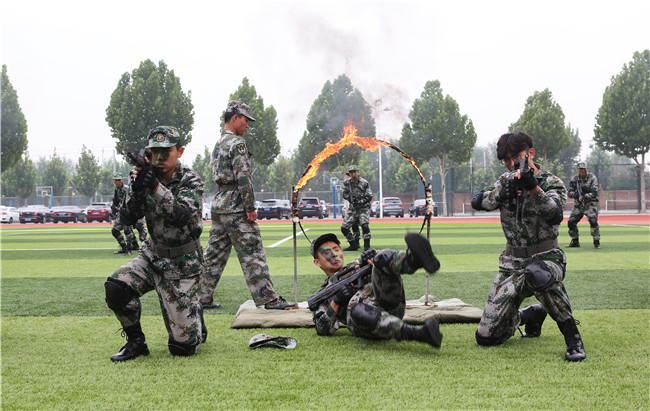 当然,最扣人心弦的当属压轴好戏——防爆防控技术表演。铁环燃起熊熊烈火,浓烟滚滚中,“防爆队员”们一个接一个地猫着身子迅速穿过“火线”,翻身着地。这些10天前的初中生,如今已能流畅完成有一定难度的军事动作,着实了不起。