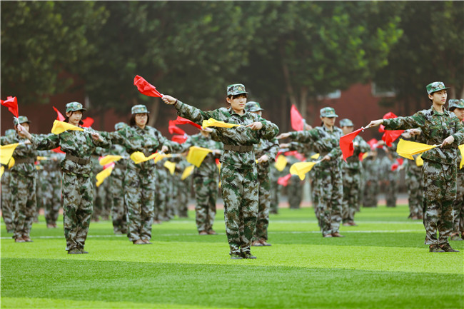 而女子方队带来的“大阵仗”海军旗语表演,单单从视觉和听觉上便征服了观众。红黄旗帜在绿色的“海洋”中分外醒目,整齐划一动作下,她们手中的小旗猎猎作响,声震王府。