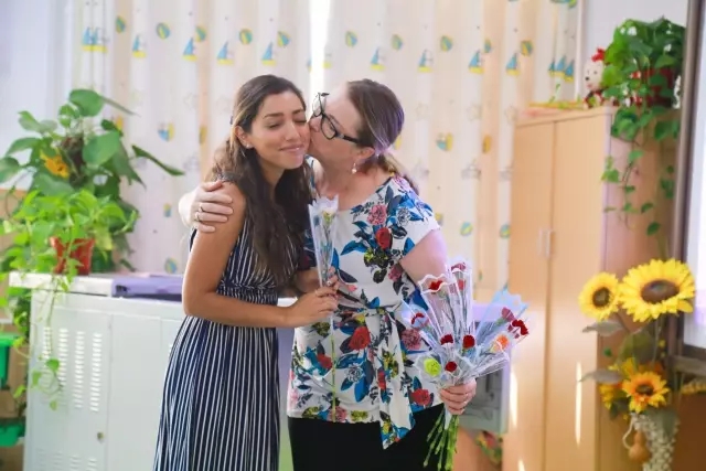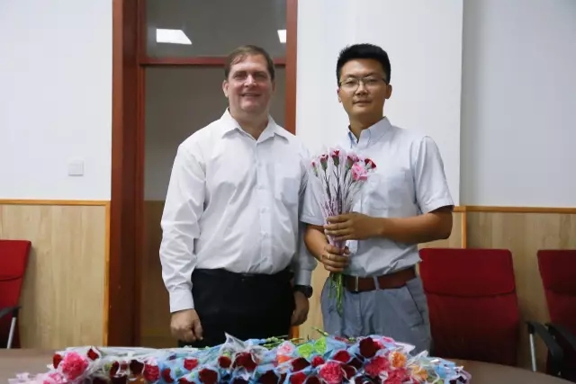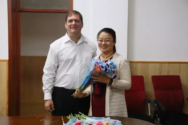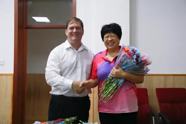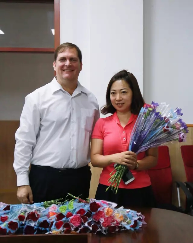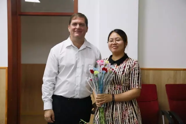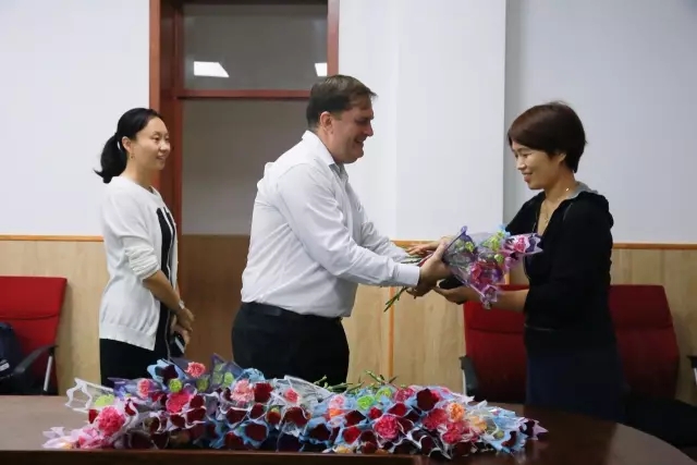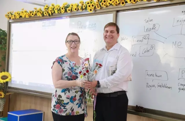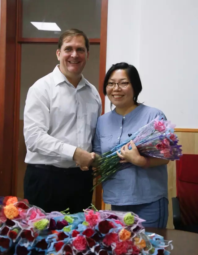生活区主管么荣萍老师代表所有导育老师从Gavin副校长的手中,接过代表着美好祝福的鲜花。