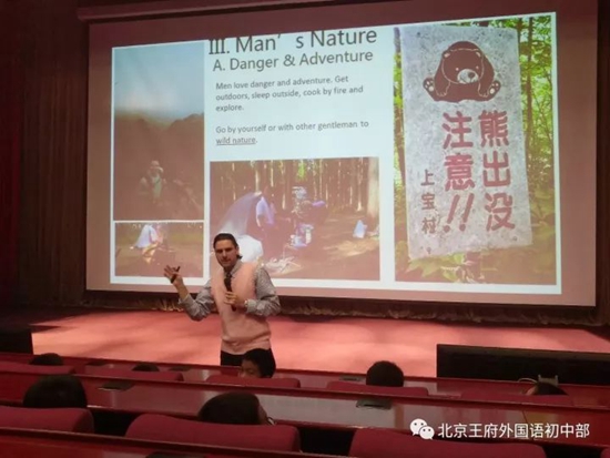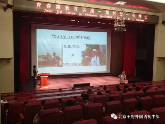 2017年10月8日,北京王府外国语学校初中部在国际报告厅组织召开了“How to be a gentleman”(“如何做一位绅士”)的主题讲座。六、七年级的男生齐聚此地,认真聆听着已经身为Gentleman的孙副校长(Mr.Littlefield)的风趣演讲。