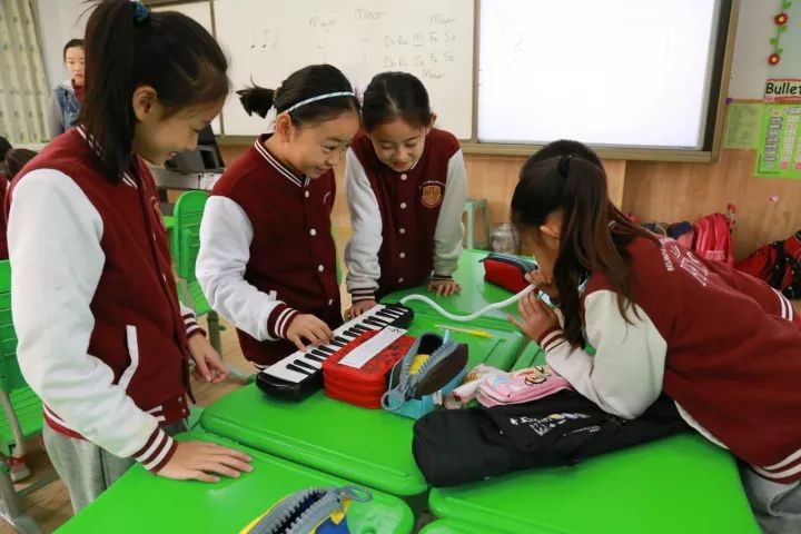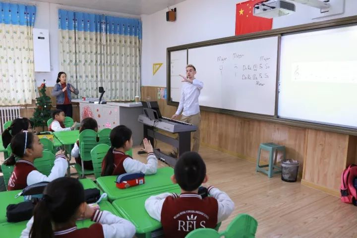 Ethen老师是这学期从北科罗莱纳州来到小学部实习的一位声乐专业教师,日常与孩子们相处得十分融洽。这次虽然是他第一次给学生上课,但与孩子们互动多多,力求用简单易懂的语言讲清楚大小调的性质。他使用电钢琴、口风琴等乐器,让孩子们在实践中学习,使得大家异常兴奋和开心,学习效果显著。
