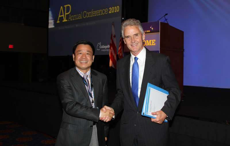▲2010年7月15日王广发校长在美国大学理事会年会上会见大学理事会总裁加斯顿·卡珀顿