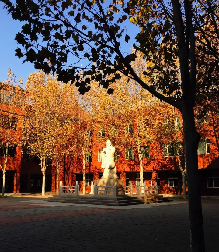 在这所中西合璧的学校,矗立在学校正中央的孔子像,在秋叶的映衬下,别有一番历史的厚重感。