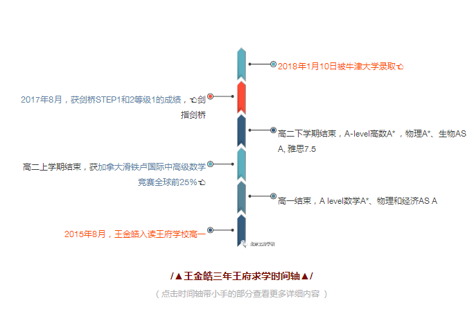王金皓擅长数学,基础扎实,学习态度踏实,上课有问题会及时和老师进行交流,课后高质量完成作业。高一结束时,他的A level数学达到了A*(Percentage 98%);高二上学期取得滑铁卢数学竞赛全球前25%,也是王府学校参赛学生里的金牌获得者;高二下学期参加的剑桥大学STEP1和2的考试均取得等级1的成绩;高二结束参加的高数A level考试取得了A*(Percentage 98%);2017年八月份参加由一百多个国内中学参加的ASDN美式数学竞赛中,取得微积分前10名、代数和几何前10%的成绩。一步一脚印,一步一台阶,这些大大小小的成绩成就了今日硕果。