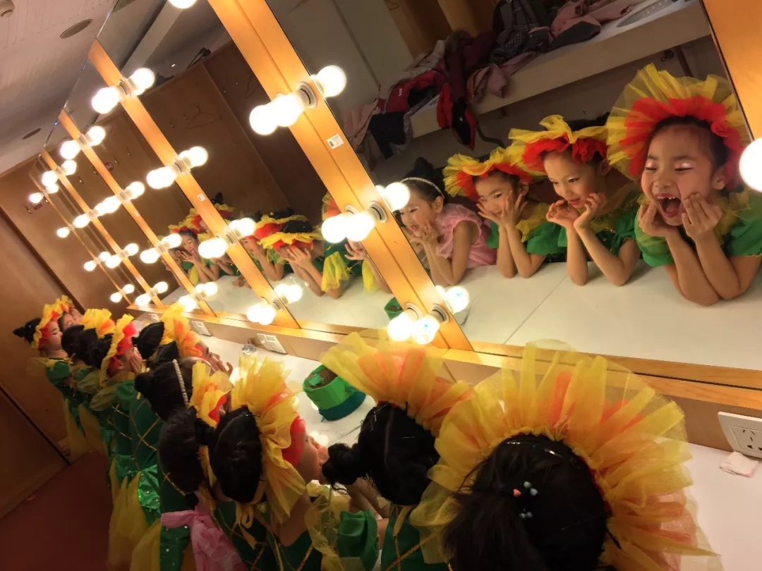 在化妆间备场之时,孩子们复习动作、活动身体、检查头饰服装,在镜子面前照一照,可爱极了。