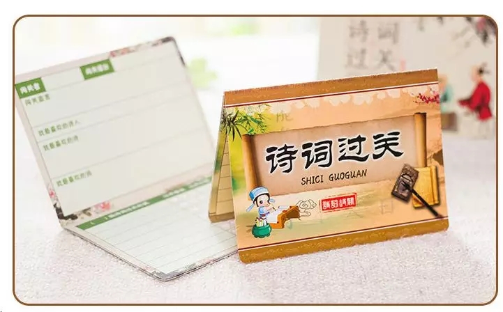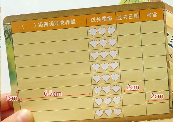 存折设计得十分巧妙精美,小小一张卡片,包括了诗词标题、背诵质量、过关日期和考官。孩子们拿到“诗词存折”之后,就可以把自己平日里积累的诗词量化记录。你考考我,我监督你,在互为考官中,不知不觉中积累了很多古诗词和中国古代文化知识。
