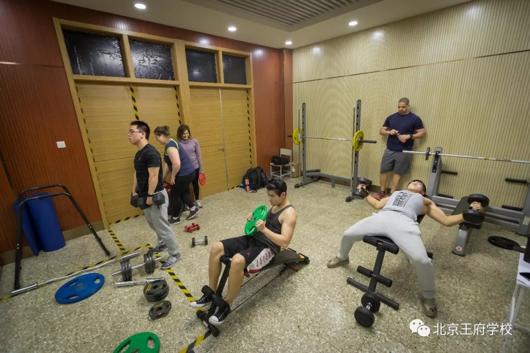 ▲秦浩原和中外伙伴们一起在健身房里挥汗如雨