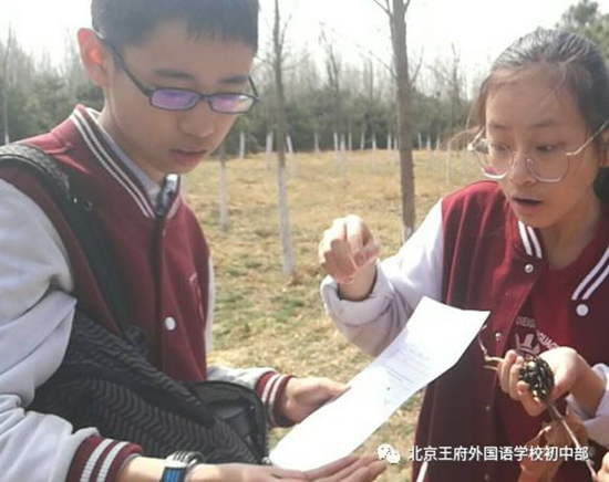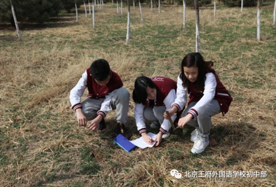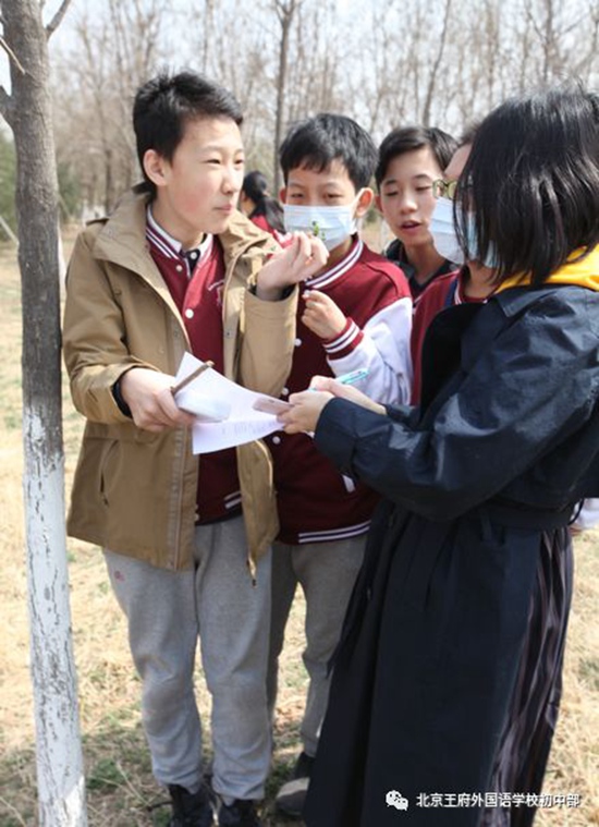 王府学校初中部积极践行以培养“积极探究的学习者”为目标的MYP教学理念,引导孩子们有意培养自己的好奇心、逐步掌握开展探究的技能,并指导学生如何与他人一起开展学习,如何对学习充满热情并保持终身热爱。美国物理学家富兰克林说过这样一句话:“告诉我,我会忘记;教给我,我可能会记住;让我参与,我才能学会。”由此,我们把生物课正在讲授的“植物学”内容与万物复苏的春天结合,把课堂搬到了学校对面的绿地公园中,通过实践探索的方式开展学习。