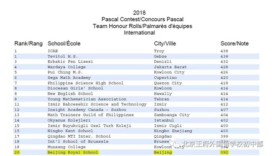 2018年滑铁卢数学竞赛,全球共计来自1544所学校的3万多位学生参加。在除加拿大以外的271所国际学校中,北京王府外国语校取得了九年级Pascal考试团体排名第20位的优异成绩。