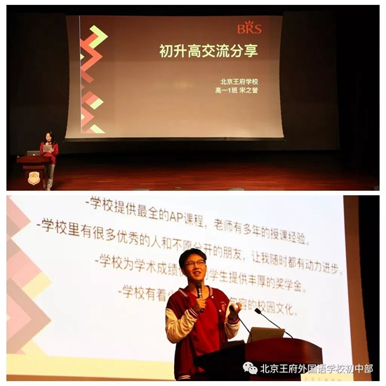 王府初中优秀毕业生宋之誉和赵鹏同学现在就读于高中部,他们与大家分享了自己的学习经历,并鼓励同学们充分利用高中丰富的学习资源,设立自己的学习目标,积极在各方面培养自己的能力。