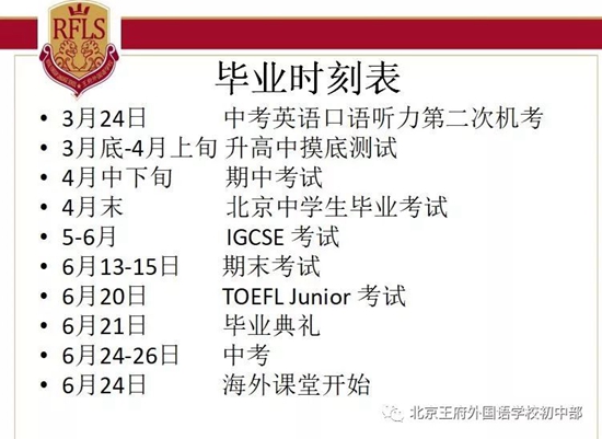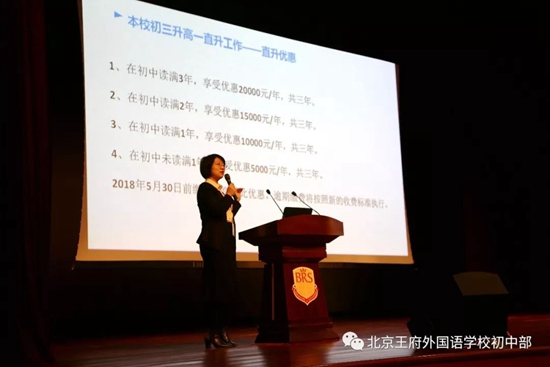 2018年3月15号,北京王府外国语学校召开了本学期初三年级家长会,就初三毕业升学问题进行了指导说明。200多位家长齐聚大礼堂。会上,学校就王府高中概况、海外升学指导、本校直升优惠政策以及初三年级学期目标等多个方面进行了细致而生动的分享。