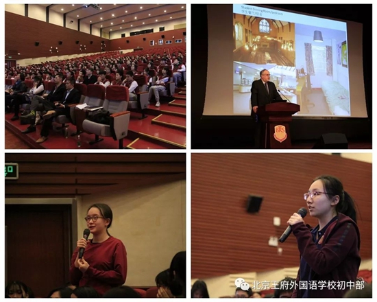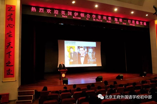 2018年4月1日,王府学校特邀伊顿公学行政长官Philip Highy先生与初中部学子进行了见面会。围绕伊顿公学的建校历史、校园结构、校园生活表和课程结构,Philip Highy先生进行了精彩的分享,同时还介绍了面向王府学校的伊顿公学夏季研修班项目。