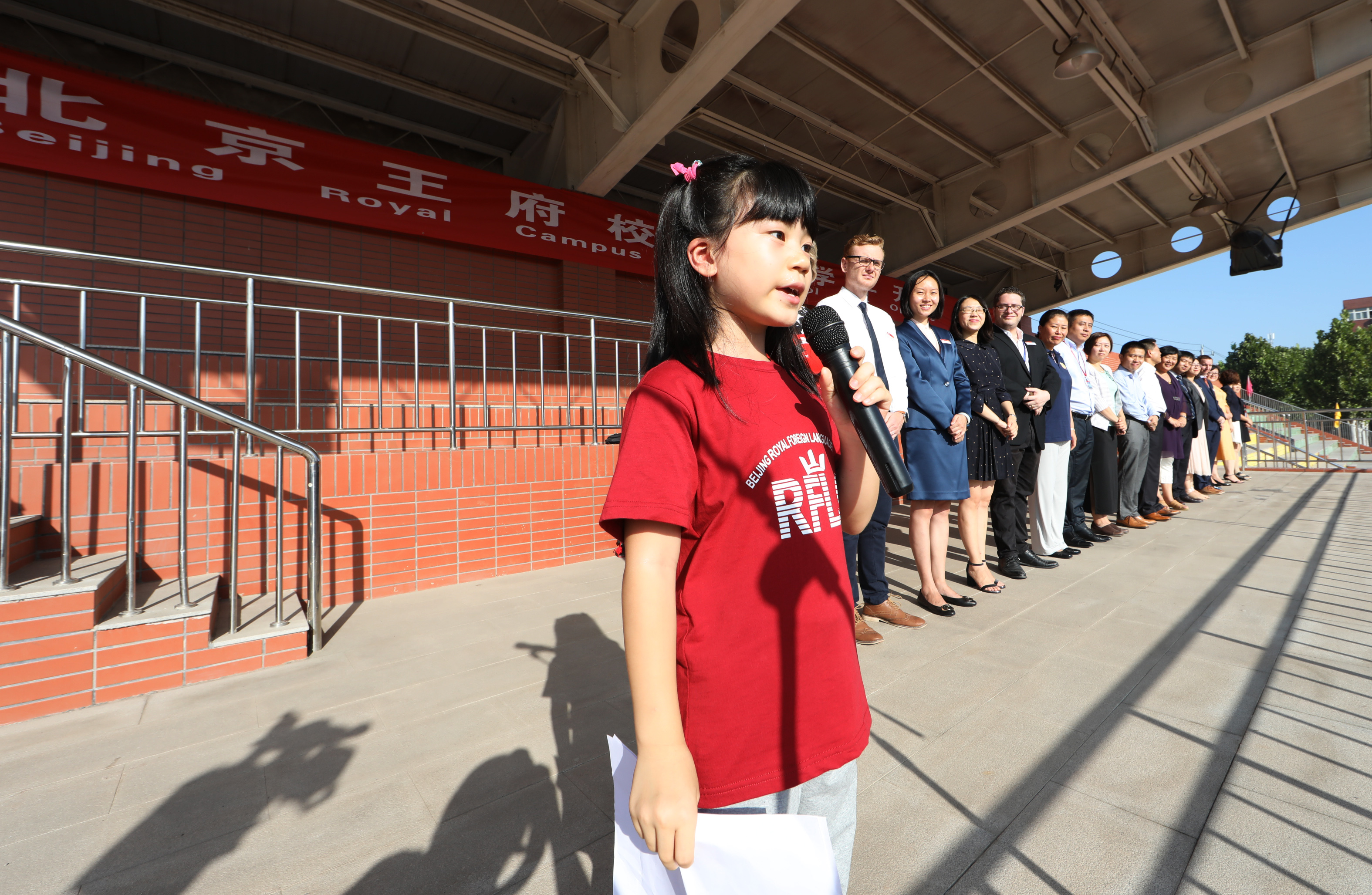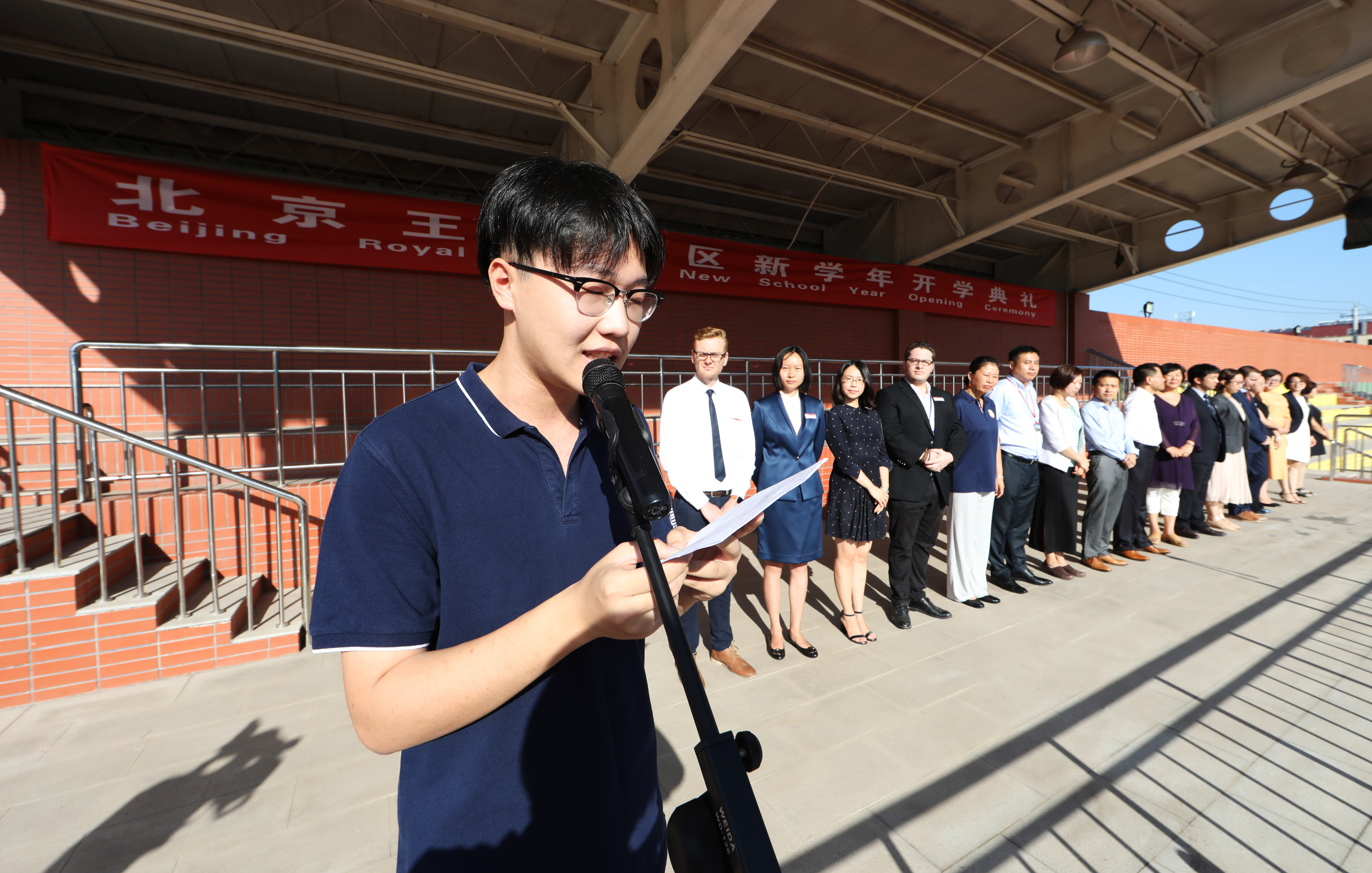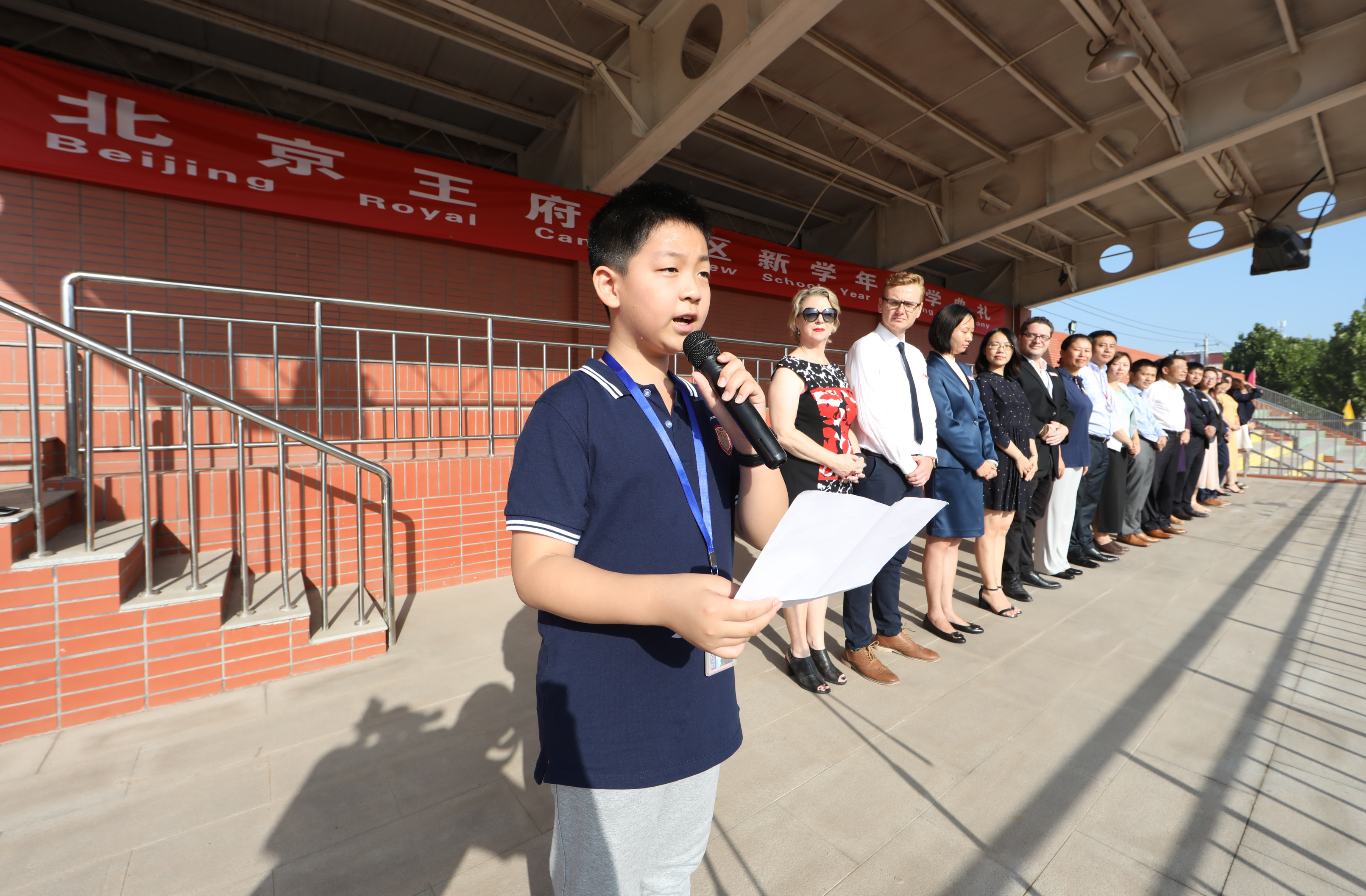 六年三班罗贝尔同学代表初中部同学发表演讲,这是他第一次离开父母、离开家,开始寄宿生活,但是亲切的老师、热情的学长、良好的后勤保障,抚平了他心中的不安。“在未来七年,我们将在王府学校找到自己的学习目标、理想,并坚持不懈地奋进、探索,成为一个着眼全球、励志未来的王府人。”