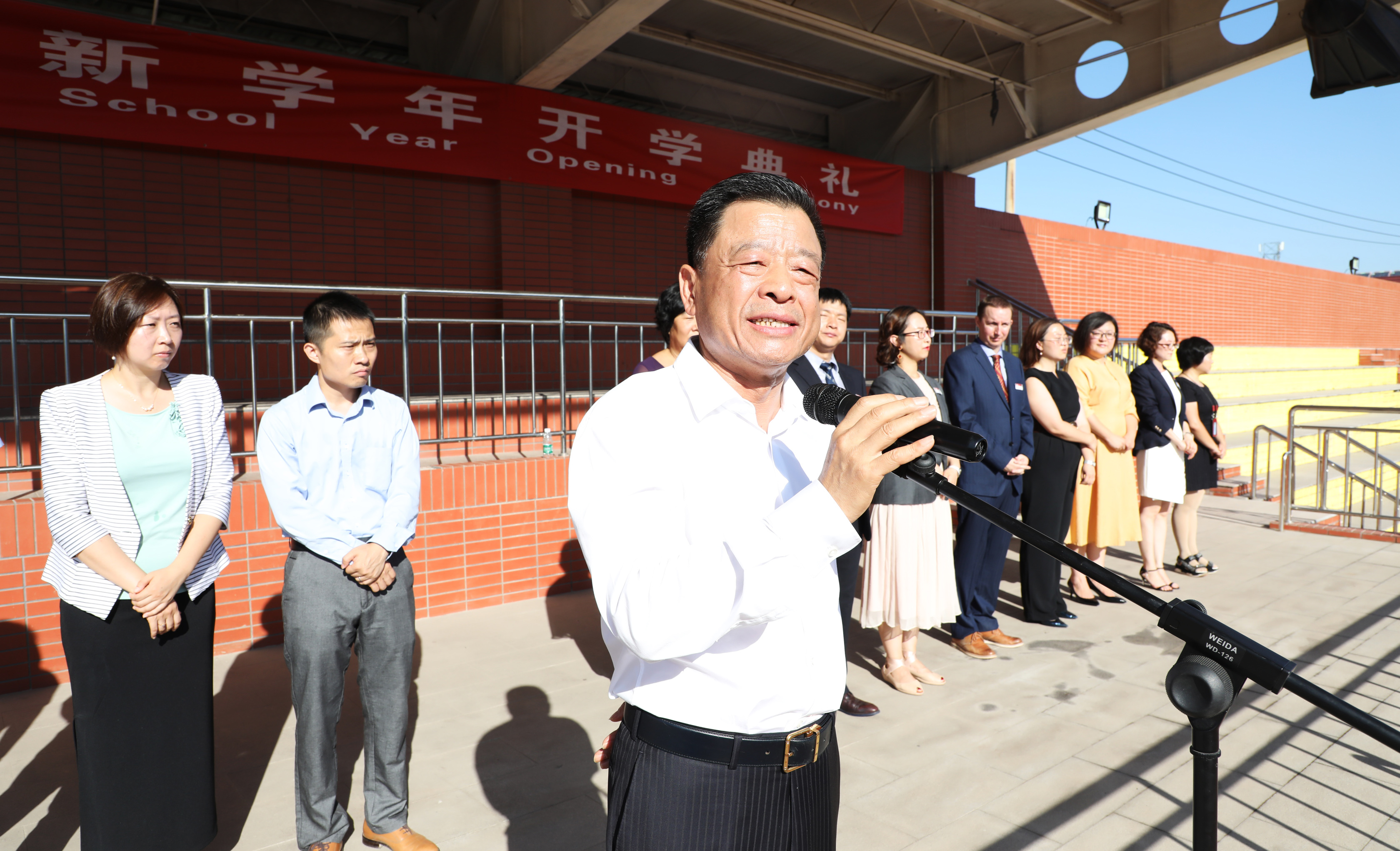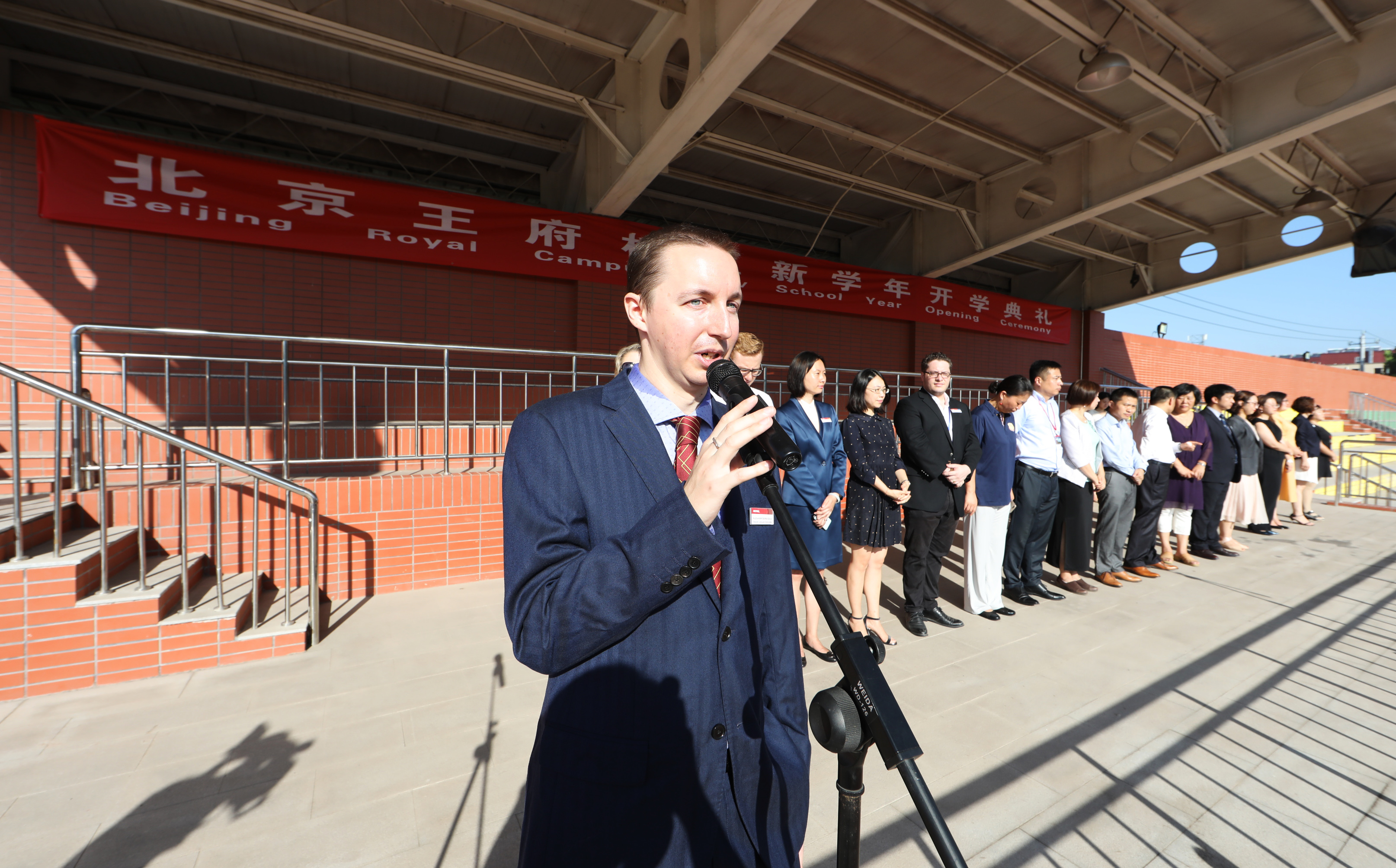 王广发校长对新加入王府的同学、老师及教职工表示热烈欢迎,并提出了新学期的要求与期待。他希望同学们以成为国际复合型人才为目标,全面提升个人综合能力。同时,他表示学校老师将一如既往履行职责,带领王府学子走得更高、更远;学校也将不断提高教学质量及服务质量,努力做好后勤保障工作,为同学们打造良好的学习生活环境。