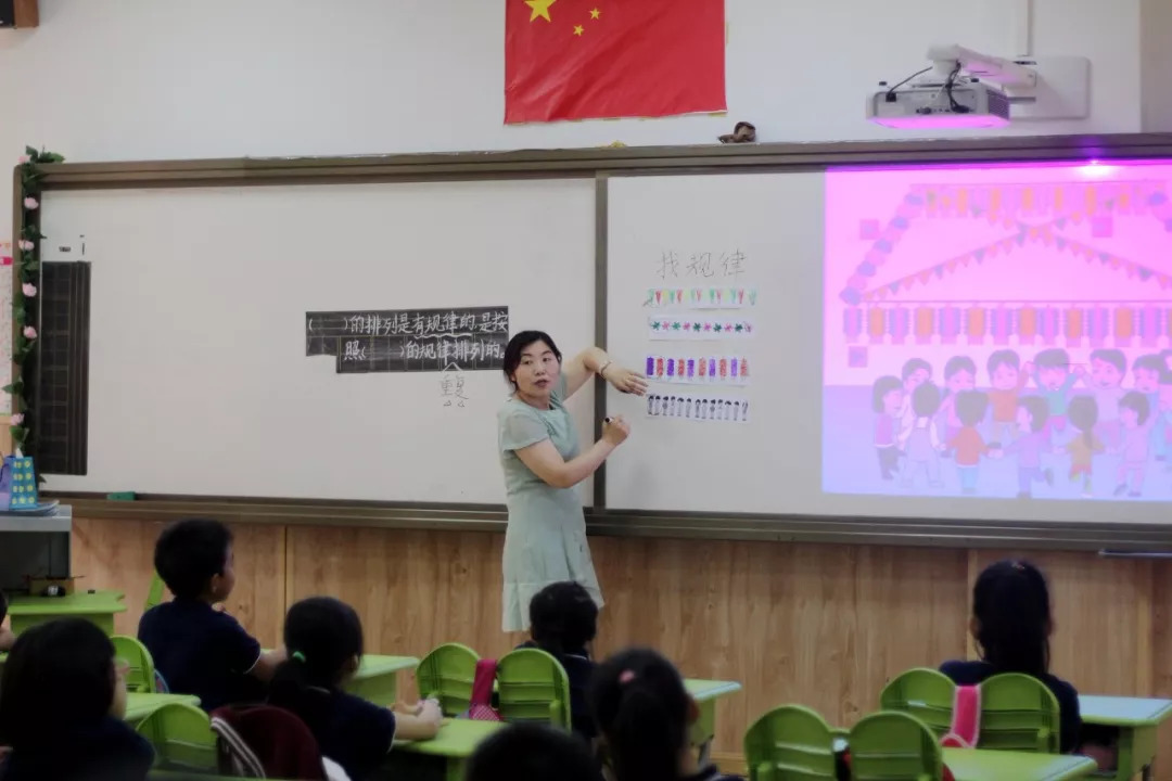 房老师的课堂设计非常生动有趣,令家长们惊叹不已:原来数学课也可以这样有趣精彩!房老师的数学课游戏充满了神秘感,只见她从神秘的提包中逐渐拉出红黄规律的花片,其间不断引导孩子们来猜想下一个拉出花片的颜色,让孩子们在游戏中观察,在观察中思考,在思考中总结,在总结后学会表达。不断重现游戏中可能出现的规律,体验感悟,印证可能,寻找出现的规律,进而学会按数学逻辑总结规律。这种寓教于乐的教学方式既提高了孩子们自主学习的兴趣,又能将知识升华,将思维拓展。直到下课铃声响起,孩子们还在那儿意犹未尽呐!