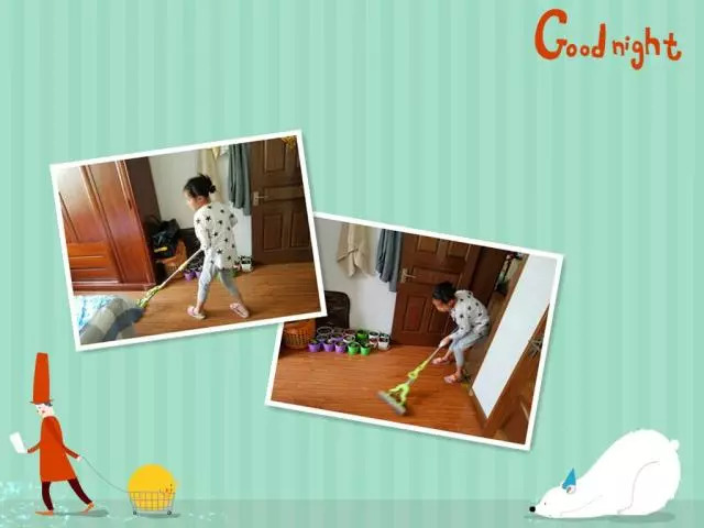 一大早,“宝贝妈妈”就起床了,自己穿好了衣服,开始学着我们平时的样子扫地、拖地,看着她撅着小屁股认真的样子,我好生感叹,平时总认为她还是个孩子,什么都不会,原来我们大人做的每一件事情,她都已经看在眼里,记在心上了,虽然动作很不熟练,但是看她努力的样子,我心里有了些许安慰。