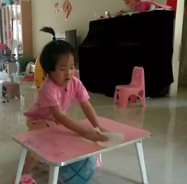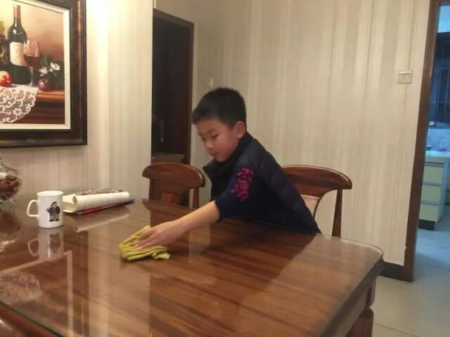 好吧,这个周末难得让我们清闲一下,只见小妈妈先把桌子擦干净,“宝贝,你去写作业吧”,两个“孩子”只好不情愿地磨蹭到书房。