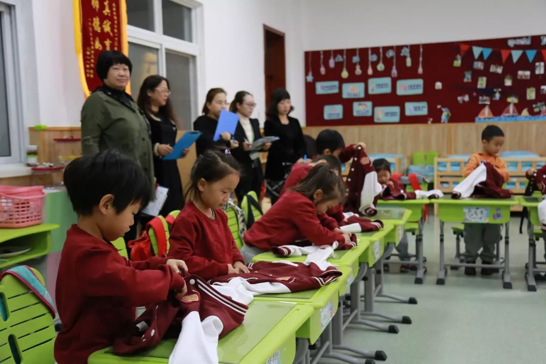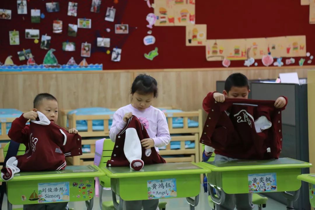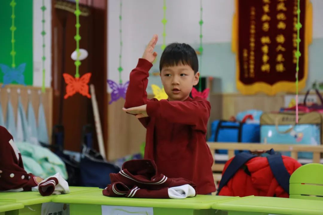 老师掌心的秒表滴答作响,孩子们的小手分秒必争。校服从刚被脱下时的皱皱巴巴到叠成“豆腐块”的整齐有致,K5班的同学们以1分15秒的速度,高质高效地完成了任务。