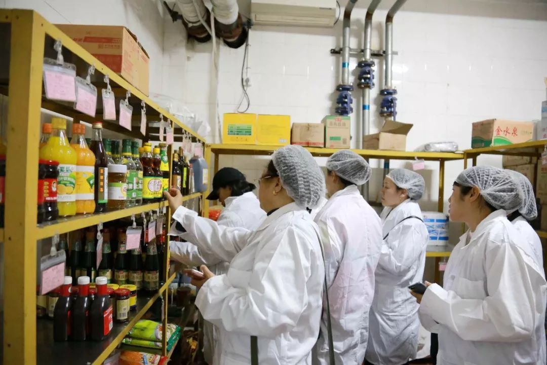 在后厨库房,家长团迈过高及膝盖的不锈钢挡鼠板,看到了米面食用油、各类调料的存储空间。家长团细心的拿起货架上的调料逐一查看,有的关注产品品牌,发现都是家庭常用的各类专业品牌,有的查看生产日期。朱厨师长介绍到,货架上的调料不可能有积压沉货,因为食堂用餐人数多,每天的用量大,都是用完之后及时补货。