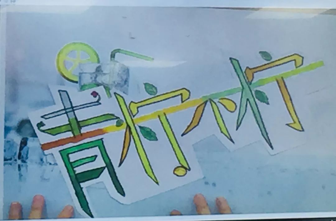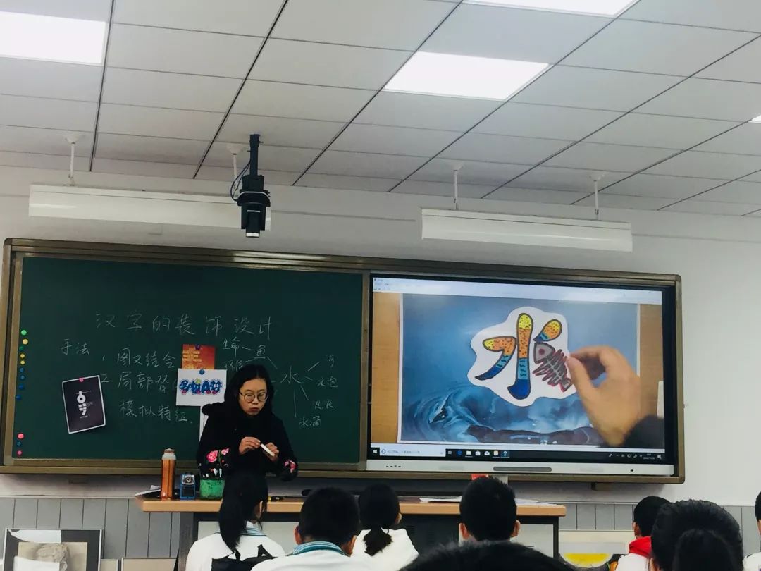 由于每节课只有40分钟时间,有些作品需要两节课完成,在第二节课程开始,就需要对上一节课做简单的回忆。本节美术课是课程的第二节,冯老师展示了几张设计好的文字图片,让同学们回答这些文字属于装饰设计中的哪种类型。通过提问的方式,带着同学们回忆了上节课的内容—汉字装饰设计的分类,让大家迅速融入到了这节课中。
