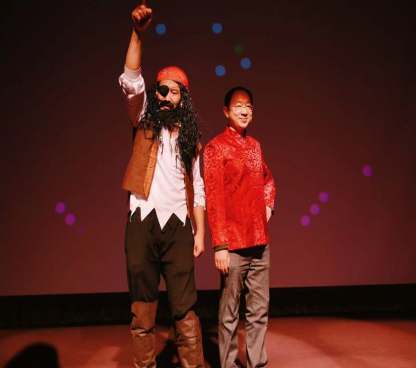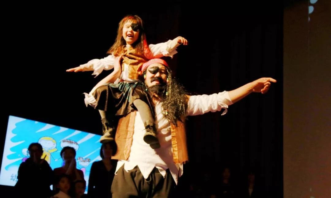 到了K6班出场的时候,乐成还在跟我设计动作,最后决定了我上场后把他抱起来,他做一个战斗的姿势。开始走了,乐成在我前面,欢快的和对面的女生一起出场,接下来就是我和女生爸爸一起出场,女生和她爸爸都是奔放的海盗造型,爸爸高大魁梧,配上皮鞋,头巾还有眼罩,大手向天空一指,一个活生生的海盗形象出现在舞台上,台下观众也发出赞叹的声音。我则是中式上衣,单手叉腰,这反差有点大。