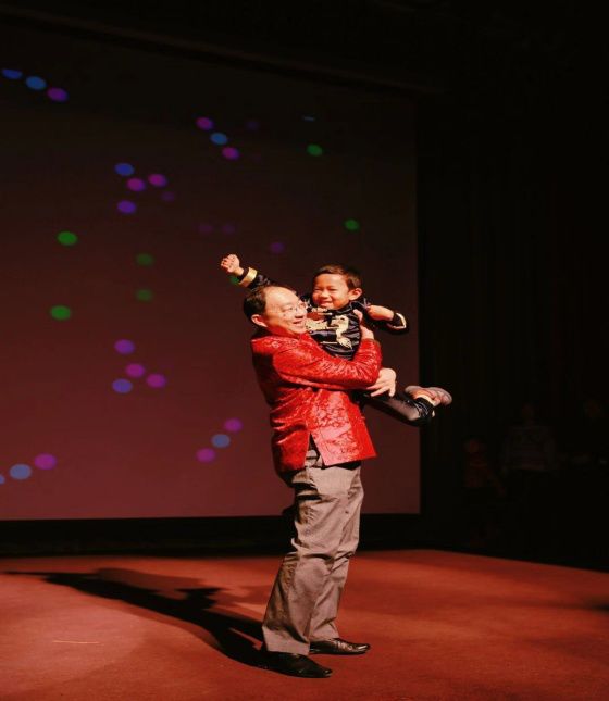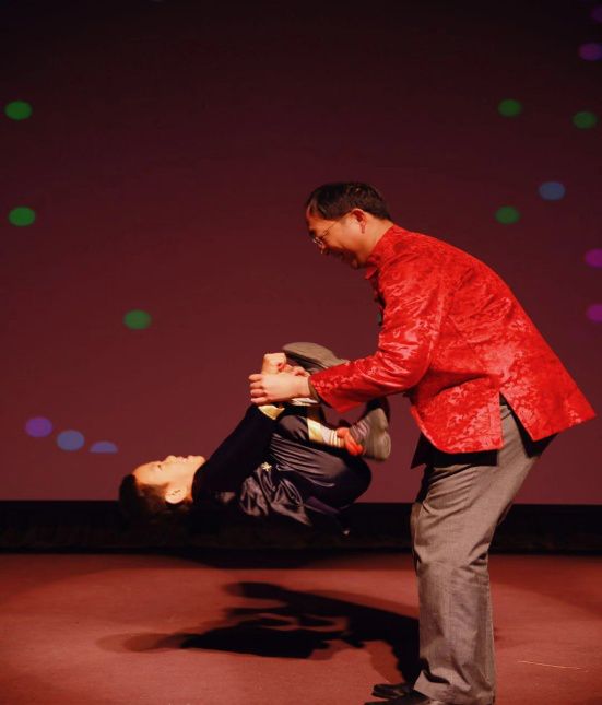 当走到“海盗”身边的时候,有千分之一秒的时间,我想高举两个大拇指给他个大大的赞,正在犹豫,海盗转身走向了自己的孩子,我便也走向乐成,心里在想着之前设计的动作,不能掉链子。我和他对视了一下,把他抱起来,他同时也在往我身上爬,我开始想把他扛到肩上,发现太沉了,就改成了抱。乐成做了一个在空中战斗的姿势,然后我们走到台后看其他人的表演。下一轮是是父子同时出场,我帮乐成做了一个翻滚动作,因为经常在家里做,所以非常熟练的完成了,台下一些同学发出了喔~的惊叹声。这个动作对家长有些要求,快落地的时候要向前弯腰,否则容易伤到孩子胳膊,不要轻易模仿。接下来的环节是女生男生分别集体走秀,老师最后压轴出场。演出结束全体拍照时,乐成摆了空中战斗的姿势,意犹未尽的感觉。