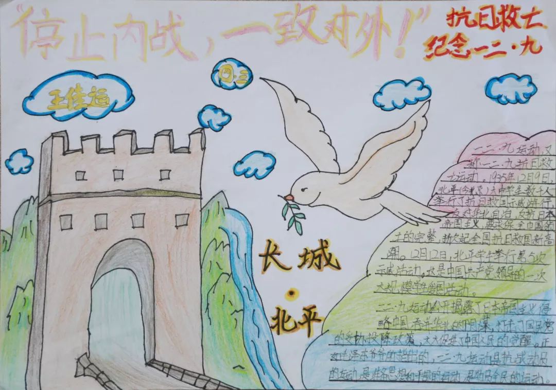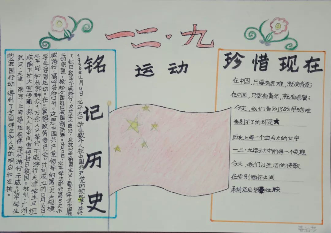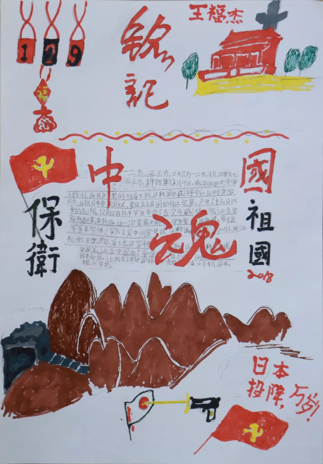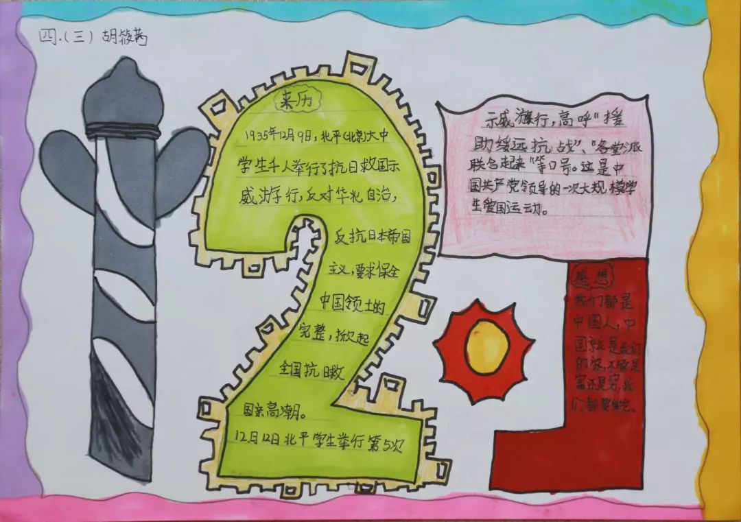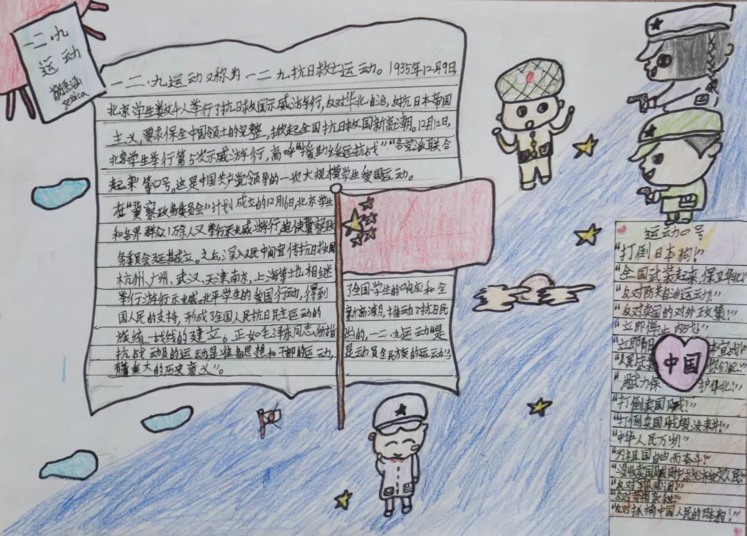 在年级组长张艳慧老师的带领下,四年级的孩子们还精心制作了一二·九运动手抄报,生动形象地诠释了一二·九运动的精髓,将先烈们勇往直前、百折不挠的革命精神发扬光大!