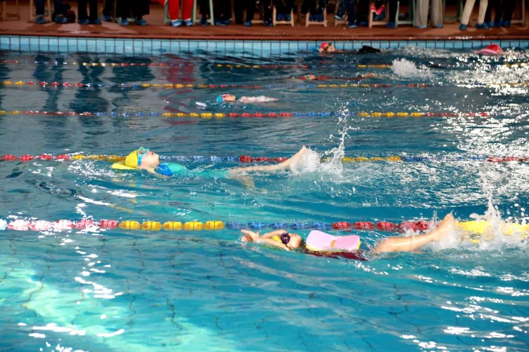 大显身手的时间到了。游泳技能展示——蛙泳,仰泳,自由泳,看我水中72变!水面上,五彩斑斓的小青蛙你追我赶,争先恐后。双腿用力向后蹬,双手使劲儿往前划,收翻蹬夹,动作娴熟。一朵朵溅起的水花在灯光下映射出美丽的彩虹。池边,爸爸妈妈们的加油声,呐喊声此起彼伏,不绝于耳,比小演员们还要紧张。