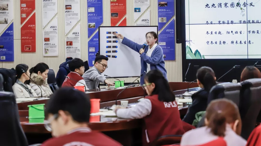 12月21日,北京王府外国语学校初中部“一阳来复 守静待春——冬至国学讲堂暨九九消寒图绘制活动”,在荣誉展厅举行,家校共聚迎接冬至来临。下午2:50,荣誉展厅在古琴音乐的浸润下变得温和宁静,桌面上已经铺好了书画用的毛毡。毛笔、宣纸、墨汁、镇纸、笔架们一个个“正襟危坐”,期待着即将到来的嘉宾。活动开始,初中部国学老师樊丽娟为大家讲授了冬至的哲学内涵与与人文意蕴。