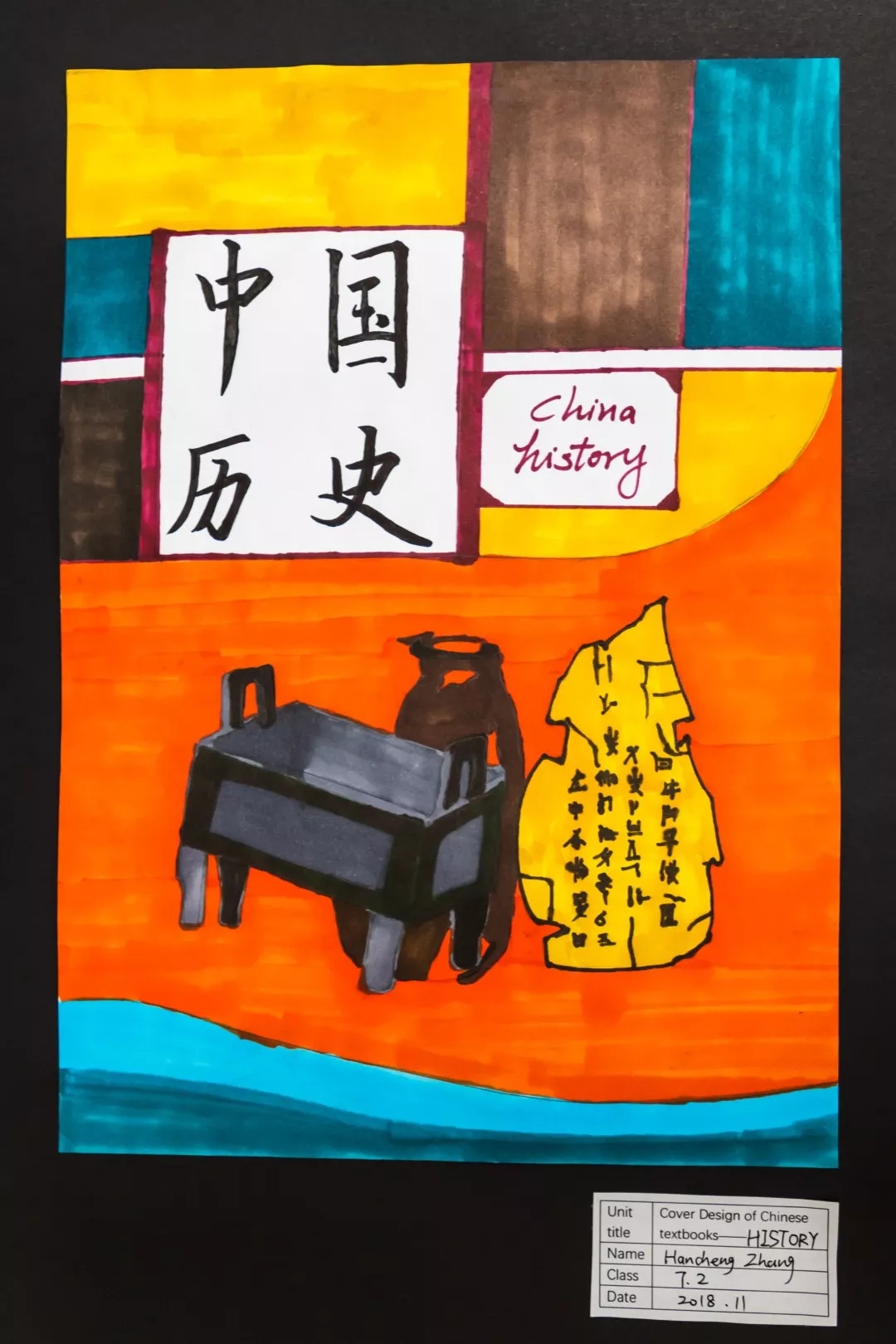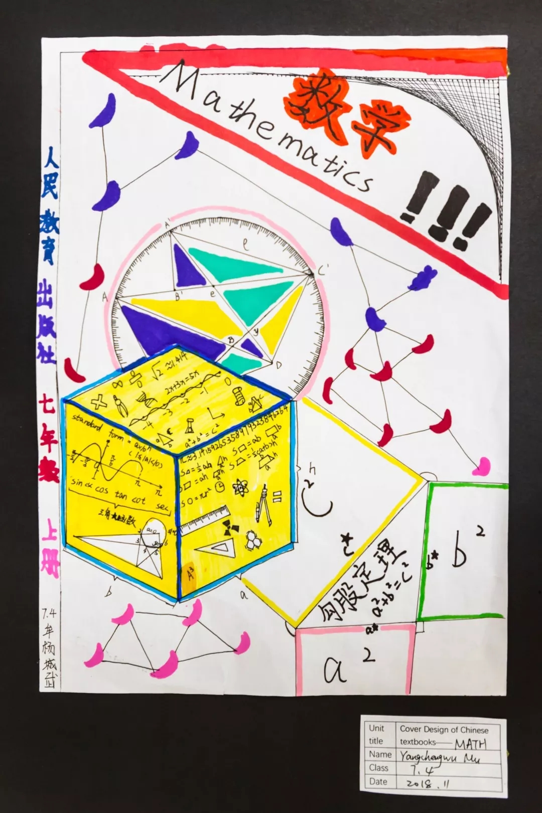 在初中部平面设计张老师的指导下,7年级的学生们重新绘制了语文、数学、美术以及国学等课程的教材封面。学习点、线、面、彩色等基础设计元素的运用,独立完成调研提交作品,他们用了近40天的时间才结束了这一项目学习。
