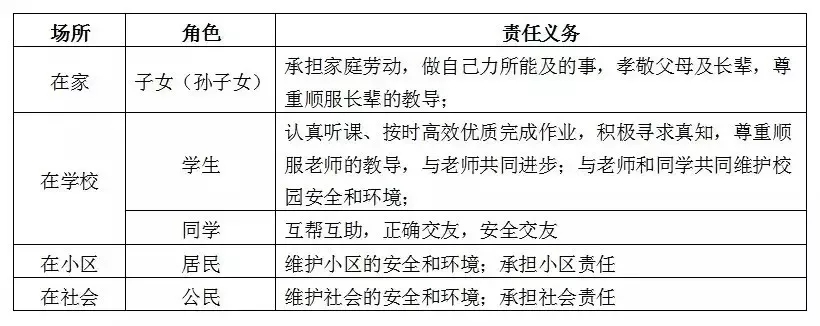 明确自己的身份和角色。作为孩子,在家里是子女(孙子女),在学校是学生和同学,在小区是居民,在社会是公民。