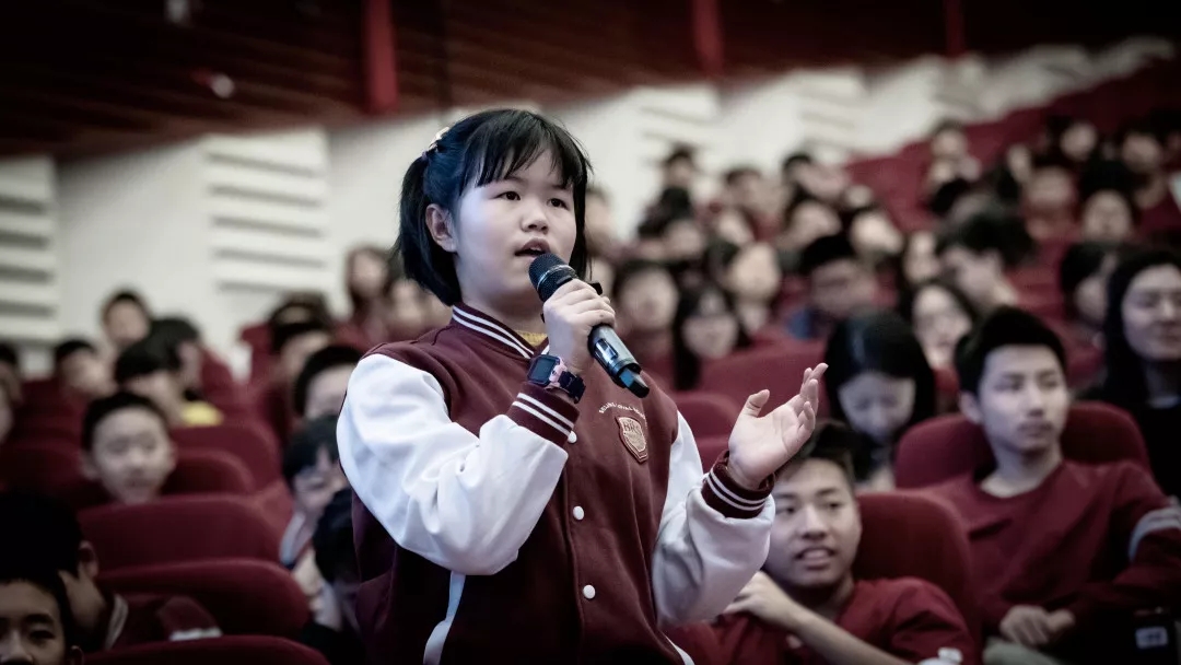 面对台上连续3届连任美国佛蒙特州州长,一个培养青年领导力的政治家——彼得·舒姆林,王府初中部7年级学生李禹田提出了自己的疑问。