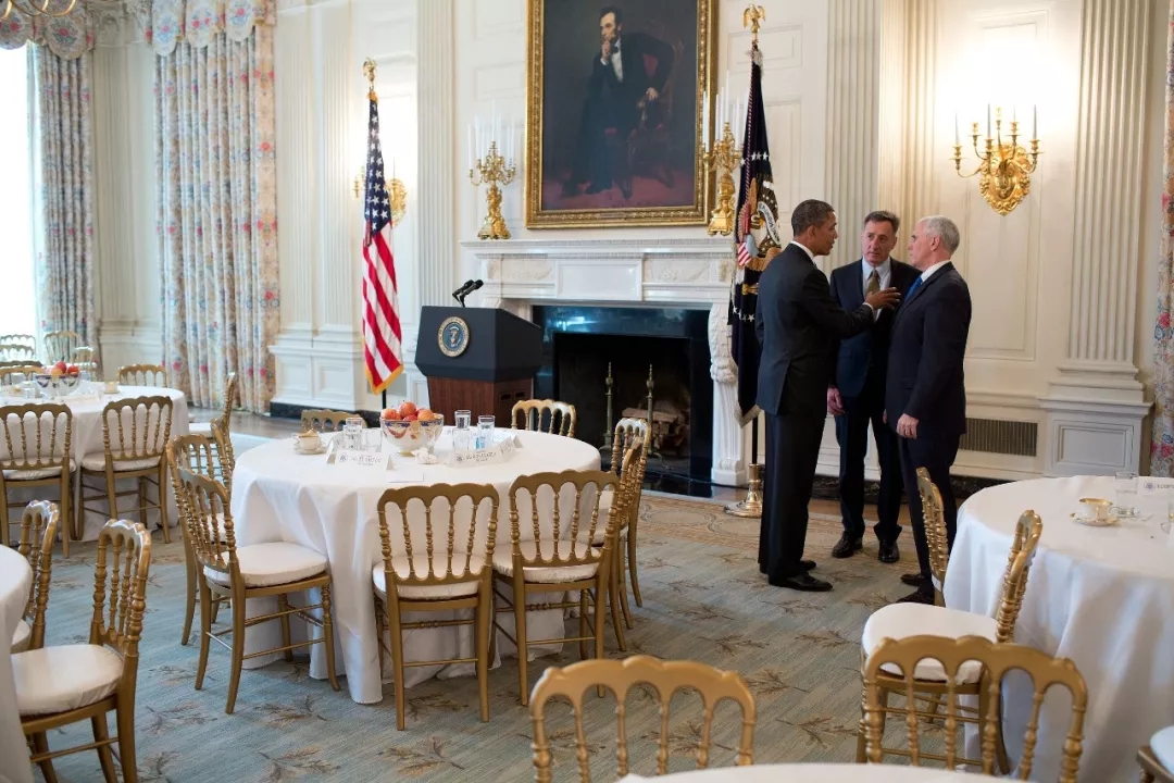 ▲2013 年,彼得·舒姆林(中)与巴拉克·奥巴马和麦克·彭斯在白宫会面。
