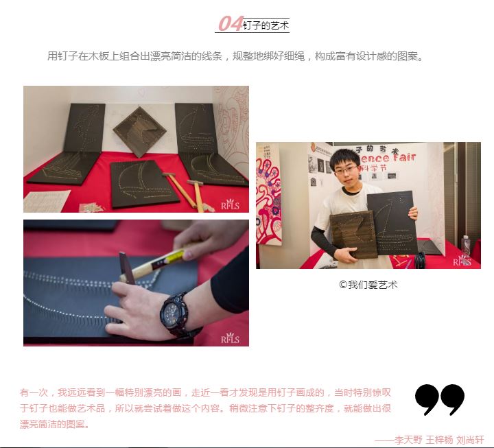 这是王府初中部第五次举办科学成果展,内容不仅涉及科学学科,还第一次将艺术创作和审美纳入项目,鼓励学生进行艺术创作,提升审美趣味。