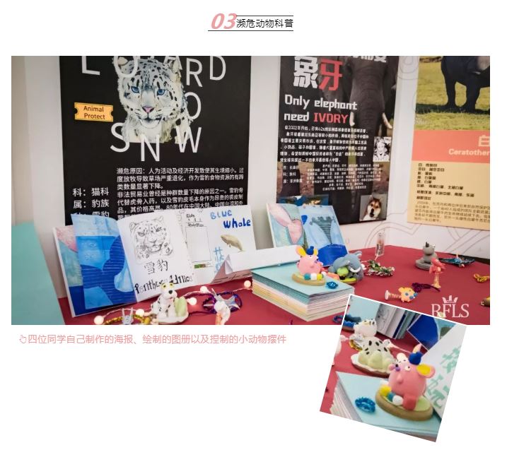 还有不少同学将探究的目光投向了生态学,他们关注到雪豹、白犀牛、大象、蓝鲸等物种的生存危机,呼吁前来观展的同学们一起关注。
