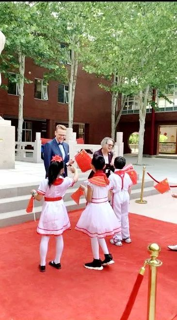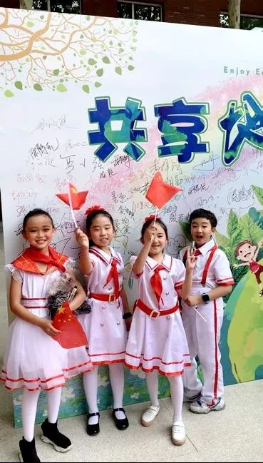 化好妆来到学校南门,映入眼帘的是鲜艳的红毯,校长、老师已经在红毯的另一头迎接我们了。孩子们兴高采烈地拿起笔,在“共享地球·快乐六一”的主题板上签下自己的名字,心里种下“爱护地球、保护环境”的种子,增强了孩子们的仪式感。