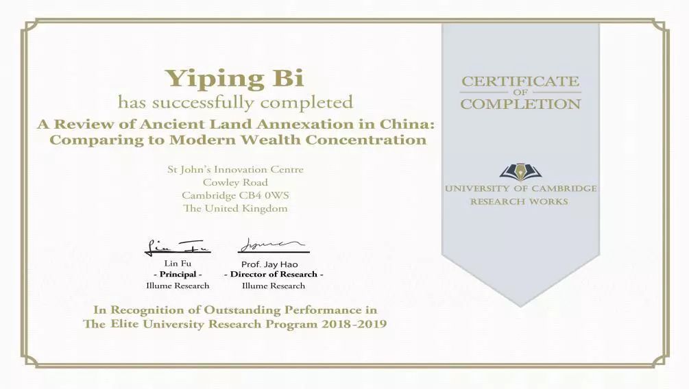 2019年5月,在普林斯顿大学政治史专业David博士的带领下,毕一平完成了论文《A Review of Ancient Land Annexation in China: Comparing to Modern Wealth Concentration(中国古代土地兼并现状评析:与现代财富集中度的比较)》的写作,并凭借这一成果受邀前往厦门,参加第四届“人文科学与社会发展”国际学术会议,在众多相关领域的学者和专家面前自信地展示自己的研究成果。