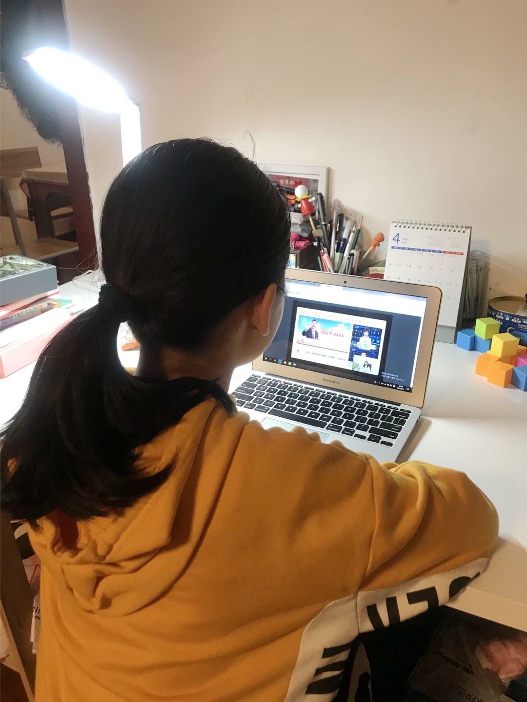 起初,我是穿着睡衣,披头散发地坐在电脑前,但后来发现这样不行,在松垮的衣装下,人很容易犯懒、走神。每周的班会课上,老师会让同学们分享网课学习经验,提醒我们在家中学会自律。这引起了我的警醒:比我学习好的同学却比我更努力,这是一件多么可怕的事呀!我开始约束自己,每天早晨换上正式的衣服,仪容整洁、态度端正。