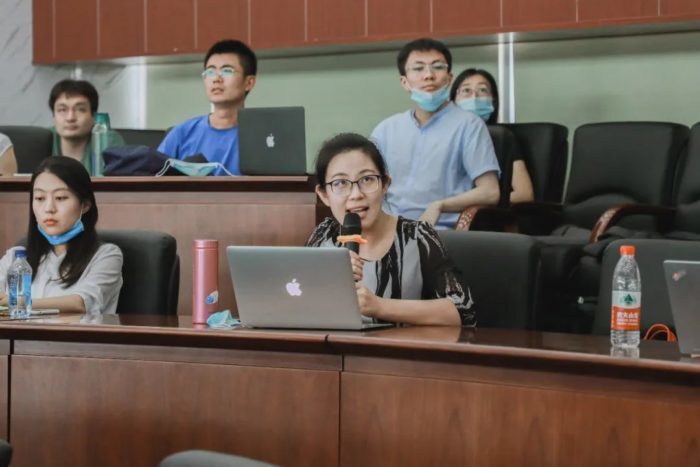 ▲王府初中部数学组解超老师就如何进行单元活动设计满足不同层次学生需求,与专家进行线上交流