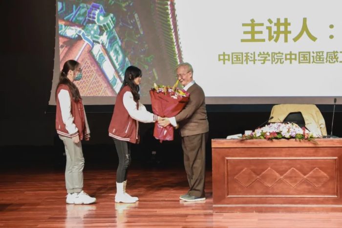 ▲讲座最后,来自我校ISSDC太空城市设计竞赛的同学为潘教授献花