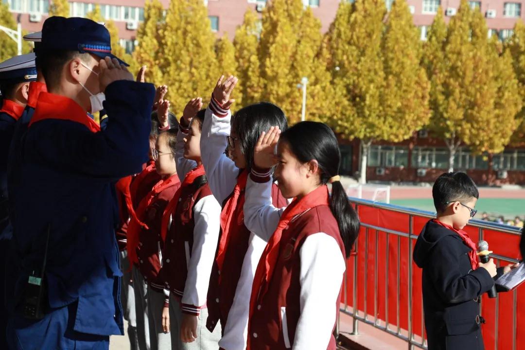 ▲学生为消防官兵佩戴红领巾并赠送礼物