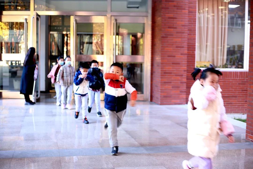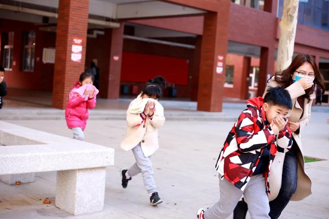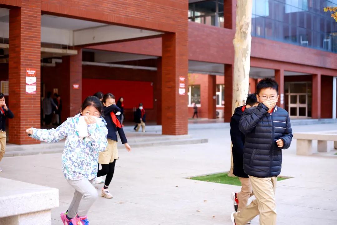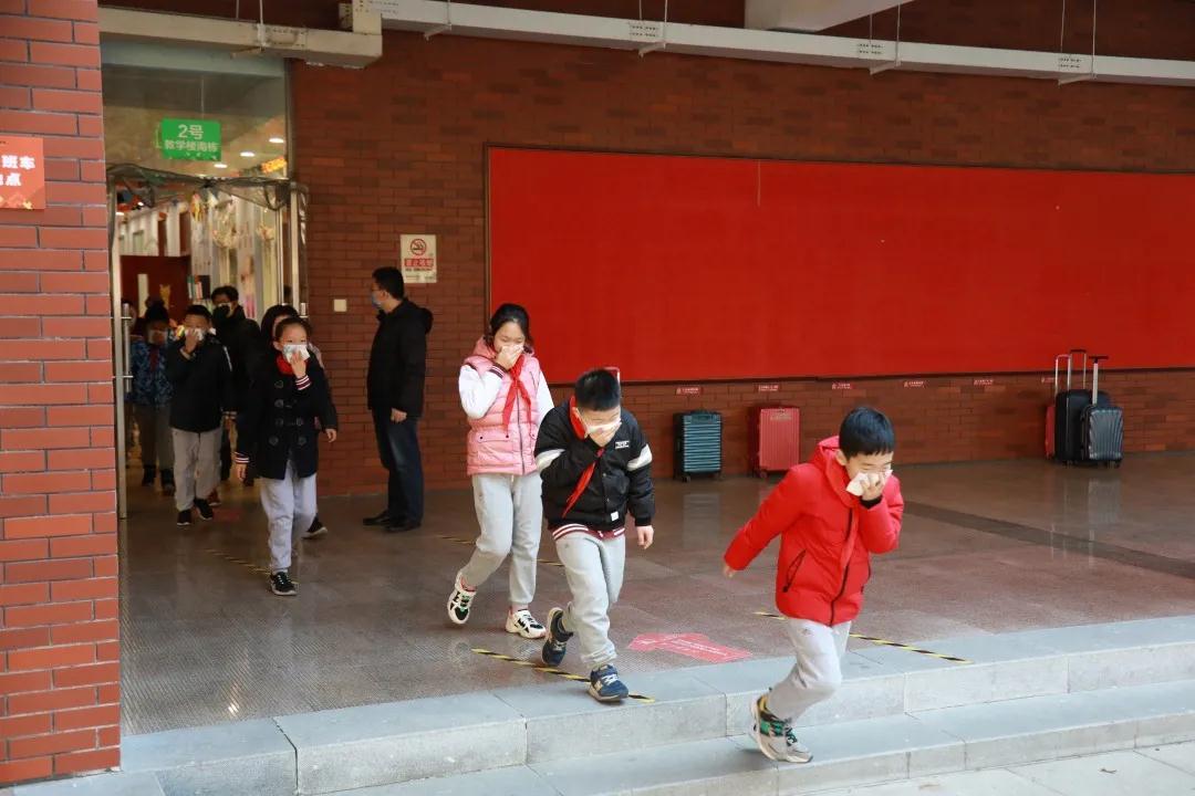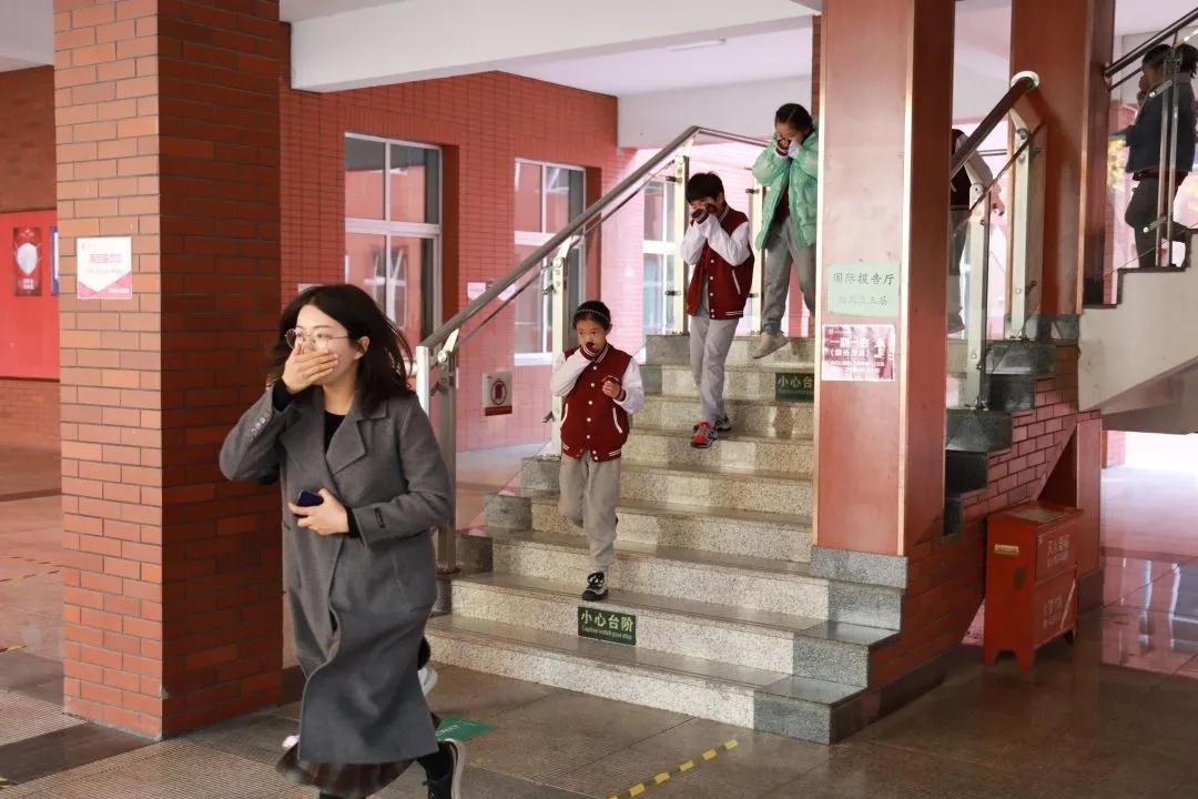 上午9:35,随着广播中传来的火警警报声,老师们第一时间到达教学楼的指定地点,引导学生按照逃生规范动作要领,沿指定路线迅速、有序撤离至大操场,按升旗仪式位置站立。