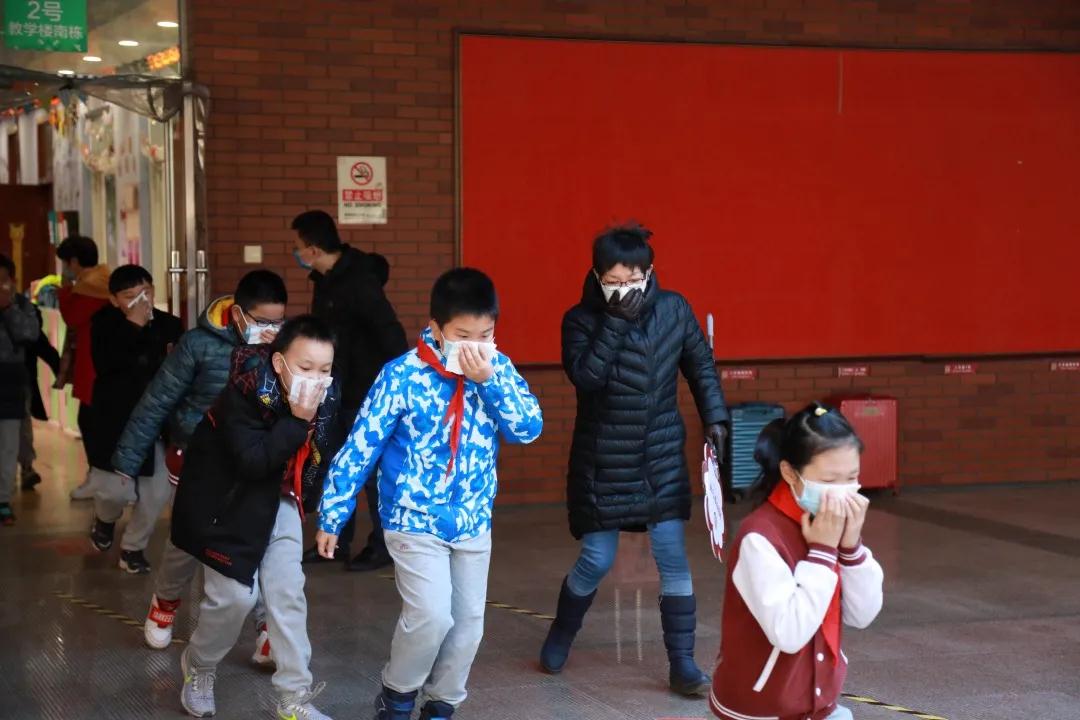 ▲学生捂住口鼻,弯腰小步前行,有序撤离